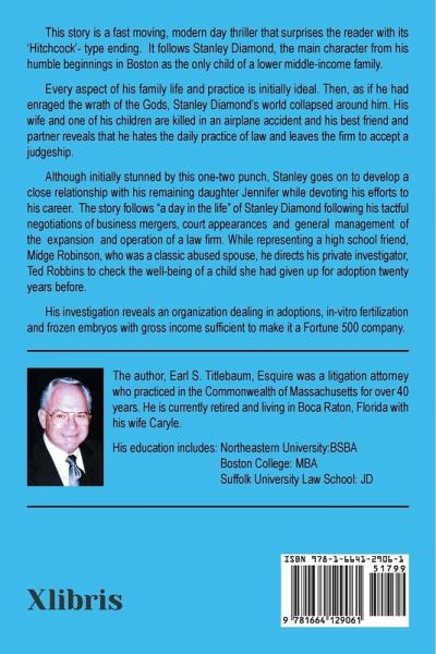 This story is a fast moving, modern day thriller that surprises the reader with its 'Hitchcock'- type ending. It follows Stanley Diamond, the main character from his humble beginnings in Boston as the only child of a lower middle-income family. Every aspect of his family life and practice is initially ideal. Then, as if he had enraged the wrath of the Gods, Stanley Diamond's world collapsed around him. His wife and one of his children are killed in an airplane accident and his best friend and partner reveals that he hates the daily practice of law and leaves the firm to accept a judgeship. Although initially stunned by this one-two punch, Stanley goes on to develop a close relationship with his remaining daughter Jennifer while devoting his efforts to his career. The story follows "a day in the life" of Stanley Diamond following his tactful negotiations of business mergers, court appearances and general management of the expansion and operation of a law firm. While representing a high school friend, Midge Robinson, who was a classic abused spouse, he directs his private investigator, Ted Robbins to check the well-being of a child she had given up for adoption twenty years before. His investigation reveals an organization dealing in adoptions, in-vitro fertilization and frozen embryos with gross income sufficient to make it a Fortune 500 company.