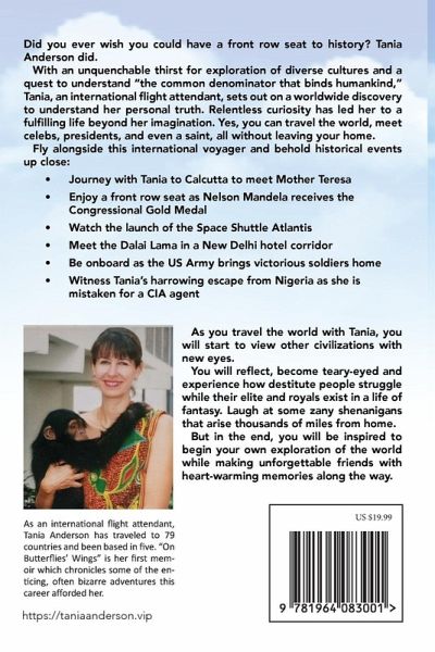 Did you ever wish you could have a front row seat to history? Tania Anderson did. With an unquenchable thirst for exploration of diverse cultures and a quest to understand "the common denominator that binds humankind," Tania, an international flight attendant, sets out on a worldwide discovery to understand her personal truth. Relentless curiosity has led her to a fulfilling life beyond her imagination. Yes, you can travel the world, meet celebs, presidents, and even a saint, all without leaving your home. Fly alongside this international voyager and behold historical events up close:Journey with Tania to Calcutta to meet Mother Teresa Enjoy a front row seat as Nelson Mandela receives the Congressional Gold Medal Watch the launch of the Space Shuttle Atlantis Meet the Dalai Lama in a New Delhi hotel corridor Be onboard as the US Army brings victorious soldiers home Witness Tania's harrowing escape from Nigeria as she is mistaken for a CIA agent As you travel the world with Tania, you will start to view other civilizations with new eyes. You will reflect, become teary-eyed and experience how destitute people struggle while their elite and royals exist in a life offantasy. Laugh at some zany shenanigans that arise thousands of miles from home. But in the end, you will be inspired to begin your own exploration of the world while making unforgettable friends withheart-warming memories along the way.