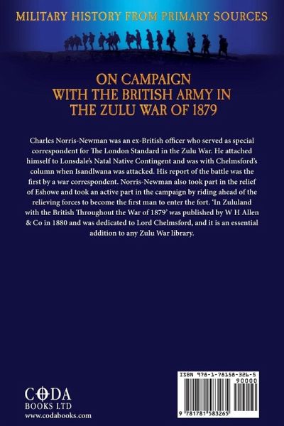 Charles Norris-Newman was an ex-British officer who served as special correspondent for The London Standard in the Zulu War. He attached himself to Lonsdale's Natal Native Contingent and was with Chelmsford's column when Isandlwana was attacked. His report of the battle was the first by a war correspondent. Norris-Newman also took part in the relief of Eshowe and took an active part in the campaign by riding ahead of the relieving forces to become the first man to enter the fort. 'In Zululand with the British Throughout the War of 1879' was published by W. H. Allen & Co in 1880 and was dedicated to Lord Chelmsford, and it is an essential addition to any Zulu War library.