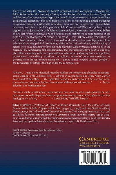 Thirty years after the 'Watergate Babies' promised to end corruption in Washington, Julian Zelizer offers a major history of the demise of the committee era Congress and the rise of the contemporary legislative branch. Based on research in over 100 archival collections, this 2004 book tackles one of the most enduring political challenges in America: barring a wholesale evolution, how can the institutions that compose representative democracy be improved so as best to fulfill the promises of the Constitution? While popular accounts suggest that major scandals or legislation can transform how government works, Zelizer shows that reform is messy, slow, multidimensional, and involves many institutions. This moment of reform in the 1970s revolved around a coalition that had worked for decades, the slow reconfiguration of the relationship between institutions, shifts in the national culture, and the ability of reformers to take advantage of scandal and elections.