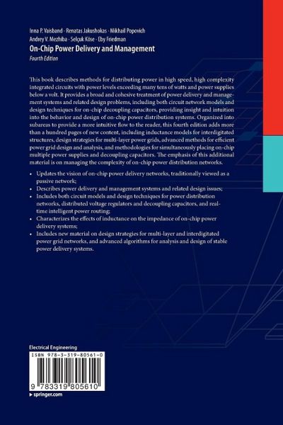 This book describes methods for distributing power in high speed, high complexity integrated circuits with power levels exceeding many tens of watts and power supplies below a volt. It provides a broad and cohesive treatment of power delivery and management systems and related design problems, including both circuit network models and design techniques for on-chip decoupling capacitors, providing insight and intuition into the behavior and design of on-chip power distribution systems. Organized into subareas to provide a more intuitive flow to the reader, this fourth edition adds more than a hundred pages of new content, including inductance models for interdigitated structures, design strategies for multi-layer power grids, advanced methods for efficient power grid design and analysis, and methodologies for simultaneously placing on-chip multiple power supplies and decoupling capacitors. The emphasis of this additional material is on managing the complexity of on-chip power distribution networks.
