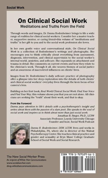 Through words and images, Dr. Danna Bodenheimer brings to life a wide range of realities for clinical social workers. Consider her a master teacher, supportive mentor, or caring friend--this volume of "meditations and truths" is her gift to you and to the social work profession she loves. In her own gentle voice and conversational style, On Clinical Social Work is a collection of Bodenheimer’s writings and photographs. She encourages you to think critically about everything from assessment, diagnosis, intervention, and clinical supervision to the social worker’s internal world, anxieties, and self-care. She expounds on attachment and trauma in detail. She comments on current events and how they relate to the clinician’s work. Through it all, she weaves themes of social justice and an awareness of macro-level influences on clients’ lives. Images from Dr. Bodenheimer’s daily self-care practice of photography offer a glimpse into her deep exploration into the details of both clients’ and clinical social workers’ everyday lives through the keen focus of her camera’s lens. Building on her first book, Real World Clinical Social Work: Find Your Voice and Find Your Way, this volume shows you that you are not alone. All clinicians are seeking the "truth" about their work, and that is okay.