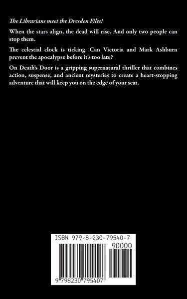 The Librarians meet the Dresden Files! When the stars align, the dead will rise. And only two people can stop them. The celestial clock is ticking. Can Victoria and Mark Ashburn prevent the apocalypse before it's too late? An ancient evil is unleashed upon the world when the planets converge in a rare celestial alignment. Victoria and Mark Ashburn, a brilliant historian and a seasoned patriot, must join forces to decipher a 2,000-year-old prophecy and prevent the apocalypse. As the undead army of King Ursa rises, the Ashburns embark on a heart-pumping adventure that takes them from the dusty archives of ancient texts to the treacherous landscapes of modern-day battlefields. Can they unravel the mysteries of the prophecy and save humanity from extinction? Or will the stars align to signal the end of the world as we know it? On Death's Door is a gripping supernatural thriller that combines action, suspense, and ancient mysteries to create a heart-stopping adventure that will keep you on the edge of your seat.