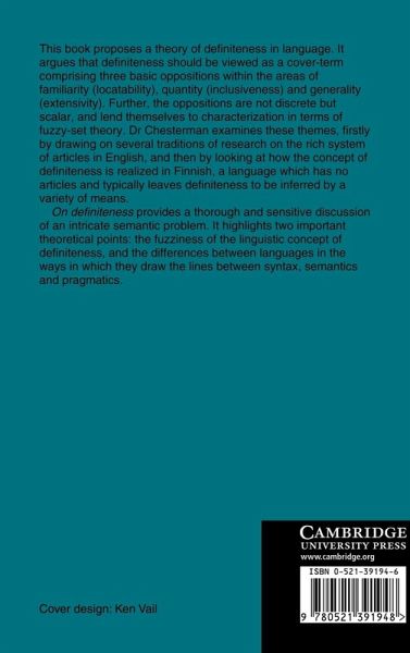 This 1991 book proposes a theory of definiteness in language. It argues that definiteness should be viewed as a cover-term comprising three basic oppositions within the areas of familiarity (locatability), quantity (inclusiveness) and generality (extensivity). Further, the oppositions are not discrete but scalar, and lend themselves to characterization in terms of fuzzy theory. Dr Chesterman examines these themes, firstly by drawing on several traditions of research on the rich system of articles in English, and then by looking at how the concept of definiteness is realized in Finnish, a language which has no articles and typically leaves definiteness to be inferred by a variety of means. On Definiteness provides a thorough and sensitive discussion of an intricate semantic problem. It highlights two important theoretical points: the fuzziness of the linguistic concept of definiteness and the differences between languages in the way in which they draw the line between syntax, semantics and pragmatics.