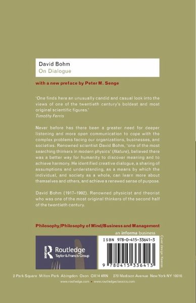 Never before has there been a greater need for deeper listening and more open communication to cope with the complex problems facing our organizations, businesses and societies. Renowned scientist David Bohm believed there was a better way for humanity to discover meaning and to achieve harmony. He identified creative dialogue, a sharing of assumptions and understanding, as a means by which the individual, and society as a whole, can learn more about themselves and others, and achieve a renewed sense of purpose.