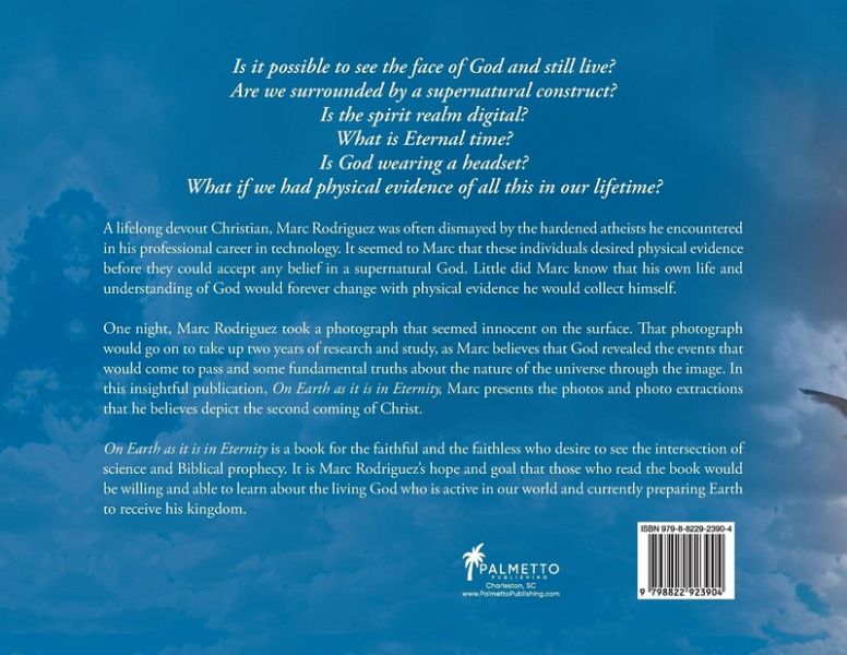 In this enlightening book, author Marc Rodriguez presents photographs of a supernatural event in the sky. Using these photos and photo extractions, Rodriquez reveals how the living God is actively preparing Earth for his return. A steadfast Christian from a young age, Marc Rodriguez was raised to have a strong personal faith in Jesus Christ and to believe in the assurance of God's grace for everlasting salvation. During his professional career in technology, Marc encountered atheists who desired physical evidence of God as a prerequisite to belief. One fateful night, Marc took a photograph that appeared benign on the surface, but that upon further study appeared to be a stunning revelation from God and a manifestation of the physical evidence he believes many individuals require to believe. In his insightful publication, On Earth as it is in Eternity, Marc Rodriguez shares photos and photo extractions that he believes bridge the gap between science and faith. In these images, God revealed to Marc the second coming of Jesus Christ as well as fundamental truths about the nature of the universe and existence. On Earth as it is in Eternity will appeal to anyone of faith who has a special interest in the intersection of science and Biblical prophecy. It is Marc Rodriguez's hope that those who read the book will be open to learning about the living God who is active and presently preparing his Kingdom for its return to Earth.