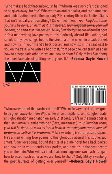 "Who makes a book that can be cut in half? Who makes a work of art, designed to be given away-for free? Who writes an anti-capitalist, anti-conglomerate, anti-globalization meditation on early 21st century life in the United States that isn't, actually, anti-anything? (Save, meanness.) Your kingdom come, your will be done, on earth as it is in heaven. Your kingdom come, your will be done, on earth as it is in heaven. Mikey Swanberg is not an absurdist poet. He's a man writing love poems to this gloriously absurd life: subtle, sad, smart, funny love songs, bound the size of a dime novel for a back pocket, and now it's in your friend's back pocket, and now it's in the seat next to you on the train. Who writes a book that, from page one, can teach us again how to accept each other as we are, how to share? Only Mikey Swanberg, the poet laureate of getting over yourself." -Rebecca Gayle Howell