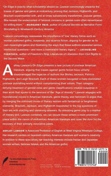 Honorable Mention, 2025 PCA Emily Toth Award For Best Single Work In Women's Studies Finalist, 2025 Mystery Writers of America's Edgar Awards, Best Critical/Biographical Category Finalist, Bouchercon New Orleans 2025 Anthony Awards, Best Critical/Non-Fiction Nominated for the 2025 Macavity Awards, Best Mystery-related Nonfiction/Critical Ashley Lawson's On Edge presents a new picture of postwar American literature, arguing that biases against genre fiction have unfairly disadvantaged the legacies of authors like Shirley Jackson, Patricia Highsmith, and Leigh Brackett. Each of these women navigated a male-dominated postwar publishing world without compromising their values. Their category-defying treatment of gender roles and genre classifications created suspense in their work that spoke to the tensions of the "Age of Anxiety." Lawson engages with foundational voices in American literature, genre theory, and feminism to argue that, by merging the dominant mode of literary realism with fantastical or heightened elements, Brackett, Jackson, and Highsmith responded to the big questions of their era with startling and unnerving answers. By elevating genre play to a marker of literary skill, Lawson contends, we can secure these writers a more prominent place within the canon of midcentury American literature and open the door for the recovery of their similarly innovative peers.