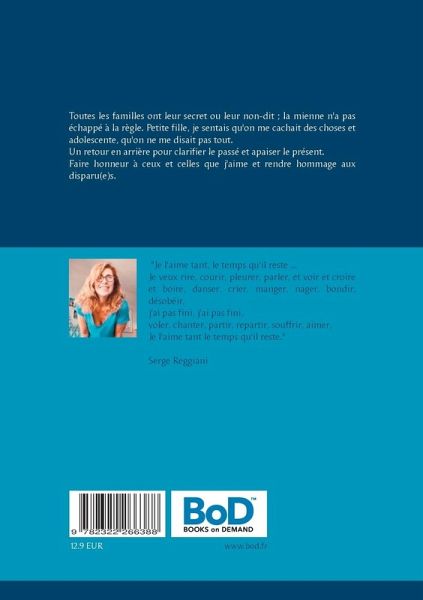 Toutes les familles ont leurs secrets ou leurs non-dits ; la mienne n'a pas échappé à la règle. Petite fille je sentais qu'on me cachaIt des choses et adolescente, qu'on ne me disait pas tout.Un retour en arrière pour expliquer le passé et apaiser le présent.Faire honneur à tous ceux et celles que j'aime et rendre hommage aux disparu(e)s.