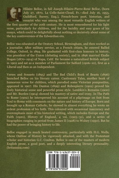 HILAIRE BELLOC was a writer and historian who was born in France on July 27, 1870, and died on July 16, 1953. Belloc also spoke in public, wrote poetry, sailed, satirized, wrote letters, served in the army, and worked for political change. His work was strongly affected by his Catholic faith. In 1902, Belloc became a naturalized British person, but he kept his French citizenship. He was President of the Oxford Union while he was at Oxford University. As a member of the British Parliament from 1906 to 1910, he was one of the few who was proudly Catholic. Belloc was known for getting into arguments, and he had a number of running feuds. He was also good friends with G. K. Chesterton and worked with him. "Chesterbelloc" was a nickname given to Belloc and Chesterton by their friend and regular debate opponent, George Bernard Shaw. Belloc wrote much more than just religious poems. He also wrote funny verse for kids. "Jim, who ran away from his nurse and was eaten by a lion," and "Matilda, who told lies and was burned to death" were two of his best-known and most-sold stories for kids. He wrote a lot of trip books and biographies of famous people, like The Path to Rome (1902).