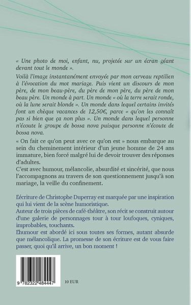 "Une photo de moi, enfant, nu, projetée sur un écran géant devant tout le monde."Voilà l'image instantanément envoyée par mon cerveau reptilien à l'évocation du mot mariage. Puis vient un discours de mon père, de mon beau-père, du père de mon père, du père de mon beau-père. Un monde à part. Un monde "où la terre serait ronde, où la lune serait blonde". Un monde dans lequel certains invités font un chèque vacances de 12,50 euro parce "qu'on ne les connaît pas si bien que ça non plus". Un monde dans lequel personne n'écoute de bossa nova puisque personne n'écoute de bossa nova."On fait ce qu'on peut avec ce qu'on est" nous embarque au sein du cheminement intérieur d'un jeune homme de 24 ans immature, bien forcé malgré lui de devoir trouver des réponses d'adultes. C'est avec humour, mélancolie, absurdité, et sincérité, que nous l'accompagnons au travers de son questionnement jusqu'à son mariage, la veille du confinement.