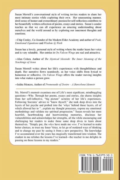 Ms. Morrell's memoir examines one of Life's most significant, mindboggling questions-Why. Through her poems, essays and stories, she shares insights from her self-reflective, "big picture" scrutiny of her life's experiences. Following Socrates' advice to "know thyself," she took deep dives into the layers of her psyche and probed into the 'whys' behind those layers, all of which allowed her to "...explain my thought processes, expose my emotional methodology and validate my spiritual progression." Susan reveals her most heartfelt, heartbreaking and heartwarming memories, discloses her vulnerabilities and acknowledges her strengths, all the while encouraging and challenging her readers to make those same deep dives to learn about themselves. "Simply put, the whys have made me wise. I've learned to make better choices, to trust my Inner Voice, to let go of outdated ways of thinking and to change my past by seeing it from a new perspective. The knowledge I've accumulated over the years has magically transformed into wisdom. The student in me relishes the lessons I've learned-the teacher in me delights in passing on those lessons to my readers."