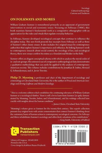William Graham Sumner is remembered primarily as an opponent of government intervention in social and economic issues. Focusing on Folkways (1906), this book examines Sumner's fundamental work as a comparative ethnographer with an appreciation for the rules and rituals that regulate everyday behavior. In Folkways, Sumner developed classifications and an array of sociological concepts that continue to influence the discipline today. This new book presents key excerpts from Folkways as well as three of Sumner's other classic essays. It also includes five original essays by contemporary authorities that explain and explore Sumner's importance and influence. By linking Sumner's work to contemporary research about social control, the sociology of law, and sociological theory, these new essays confirm his status as a foundational thinker in the field. Sumner offers an elegant conceptual schema with which to analyze the moral codes of in- and out-groups. His extensive use of comparative anthropological data demonstrates a qualitative methodology that can easily be applied to the analysis of contemporary American society. This volume includes contributions by Jonathan B. Imber, Howard G. Schneiderman, and A. Javier Trevino.
