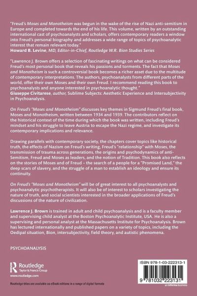 "Freud's works are an inexhaustible source of inspiration and knowledge. In "On Freud's Moses and Monotheism," Lawrence Brown offers a selection of fascinating writings on what can be considered Freud's most personal book, the one that reveals his passions and torments. The fact that Moses and Monotheism is such a controversial, flawed, and in many ways obscure book becomes a richer asset due to the multitude of contemporary interpretations that lurk in the folds of this last 'non-analytic' child of Freud. The authors, psychoanalysts from different parts of the world, each offer their own Moses and their own Freud. The reader thus has the opportunity to meet living and contemporary characters, who give this classic a new surprising vitality. I highly recommend reading "On Freud's Moses and Monotheism" to all psychoanalysts, scholars of humanities, and anyone who is interested in psychoanalytic thought." - Giuseppe Civitarese, author, Sublime Subjects: Aesthetic Experience and Intersubjectivity in Psychoanalysis (Routledge)