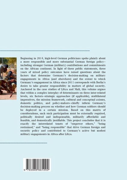 Beginning in 2014, high-level German politicians spoke plainly about a more responsible and more substantial German foreign policy¿including stronger German (military) contributions and commitments on the African continent. In light of these public statements, three years of mixed policy outcomes have raised questions about the factors that determine Germany¿s decision-making on military engagements in Africa (and elsewhere) and the extent to which Germany¿s engagement in Africa since 2011 corresponds with Berlin¿s desire to take greater responsibility in matters of global security. Anchored in the case studies of Libya and Mali, this volume argues that within a complex interplay of determinants on three inter-related levels, six factors¿strategic approaches (if applicable), multilateral imperatives, the mission framework, cultural and conceptual axioms, domestic politics, and policy-makers¿chiefly inform Germany¿s decision-making process on whether and how German soldiers should be deployed in a certain mission. Based on this matrix of considerations, each such participation must be externally required, politically desired and indispensable, militarily affordable and feasible, and domestically justifiable. This project concludes that it is exactly the interrelated tenets of ¿empower others,¿ ¿being restrained,¿ and ¿being responsible¿ that drive German foreign and security policy and contributed to Germany¿s active but modest military engagements in Africa after Libya.