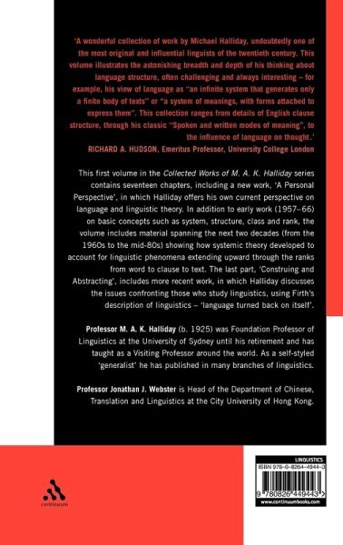 For nearly half a century, Professor M. A. K. Halliday has been enriching the discipline of linguistics with his keen insights into the social semiotic phenomenon we call language. This ten volume series presents the seminal works of Professor Halliday. This first volume contains seventeen papers, including a new chapter entitled 'A Personal Perspective', in which Halliday offers his own current perspective on language and linguistic theory. The first part of the book presents early papers (1957-66) on basic concepts such as system, structure, class and rank. The second part highlights how, over the span of two decades (the 1960s to mid-1980s), Halliday developed systemic theory to account for linguistic phenomena extending upward through the ranks from word to clause to text. The last part, 'Construing and Abstracting', includes more recent work, in which Halliday discusses the issues confronting those who study linguistics, using Firth's description of linguistics - 'language turned back on itself'.