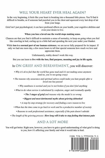 Will Your Heart Ever Heal Again? In the very beginning, it feels like your heart is breaking into a thousand little pieces. You'll find it difficult to breathe, as if someone had punched you in the chest and squeezed every last drop of air from your lungs. Grief isn't just psychological, it can have profound effects on your health, your cognitive abilities and even your desire to live. When you lose a loved one the world stops making sense. Chances are that you find it difficult to maintain a sense of normalcy, to keep on going when you feel like crawling in bed, curling up in a little ball and spending the next year under your blanket. While loss is a normal part of our human existence, we are never fully prepared for its impact. If only we had one more day, a few more hours to tell that special someone how much we love and appreciate them. Unfortunately, reality doesn't work this way. On top of that, societal notions of grief are tremendously skewed. You're anticipated to be tough, you're often being told that you have to get over it. That's not how grief works. It's not a switch you can flick on and off. Grief will be with you for the rest of your life. Time doesn't heal such wounds. But you can learn to live with the loss, find purpose, meaning and joy in life again. In On Grief and Bereavement, you will discover:Why it's ok to feel that the world has gone mad and it's not making sense anymore (and no, you're not going crazy) The reasons why assurance and spiritual advice could make you hate people after a loved one has passed Why numbness is normal and you're not broken if you don't feel anything What to do when sorrow is substituted by confusion, anger and eventually apathy The 5 stages of grief and reasons why the model is so wrong Biggest and most detrimental myths about grieving debunked A step-by-step strategy for recovery and finding a new reason to live When has the time come to go back to work and be a productive member of society Reasons to seek professional assistance, especially if the pain doesn't subside The length of the grieving process: How long will it take to stop feeling that intense pain And a lot more. Right now, you feel like you're alone in this world. Nobody has gone through what you experience, nobody has been in your shoes. However, the truth is, millions of others have had to face a devastating loss. It has turned their lives upside down and some haven't been capable of recovering. You will get better. Right now, however, you have to gain a better understanding of what grief is doing to you, how it's affecting your family and what it takes to heal.One day, you will remember your dear departed fondly and the pain will subside. Get this book now if you want to discover new meaning and continue the legacy of that special person.
