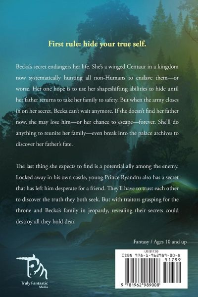 First rule: hide your true self. Becka's secret endangers her life. She's a winged Centaur in a kingdom now systematically hunting all non-Humans to enslave them-or worse. Her one hope is to use her shapeshifting abilities to hide until her father returns to take her family to safety. But when the army closes in on her secret, Becka can't wait anymore. If she doesn't find her father now, she may lose him-or her chance to escape-forever. She'll do anything to reunite her family-even break into the palace archives to discover her father's fate. The last thing she expects to find is a potential ally among the enemy. Locked away in his own castle, young Prince Ryandru also has a secret that has left him desperate for a friend. They'll have to trust each other to discover the truth they both seek. But with traitors grasping for the throne and Becka's family in jeopardy, revealing their secrets could destroy all they hold dear. Jump into the adventure of this clean middle grade fantasy featuring forbidden friendship, accepting your unique self, and a world of mythical creatures including Fauns, Griffins, Pegasi, and more! A perfect choice for fans of The Chronicles of Narnia, Percy Jackson, and The Wingfeather Saga.