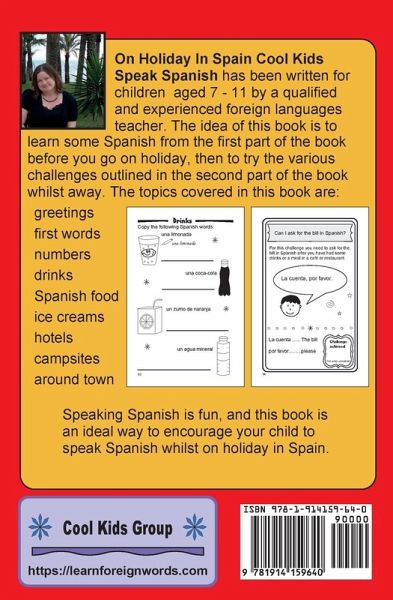 The idea of this book is to learn some Spanish from the first part of the book before you go on holiday, then to try the various challenges outlined in the second part of the book whilst away. The topics covered in this book are greetings, essential Spanish words, numbers, drinks, typical Spanish food, ice creams, asking for the bill, hotels, campsites & around town. The suggested age range for this book is 7 - 11 year olds, but the fun activities may also interest children of other ages. This book is one of a series of books by Joanne Leyland, a qualified teacher, with 20 years experience of teaching languages to children. Speaking Spanish is fun, and this book is an ideal way to encourage your child to speak Spanish whilst on holiday in Spain. Also available by the same author are the following books: Cool Kids Speak Spanish - Books 1, 2 & 3; 40 Spanish Word Searches Cool Kids Speak Spanish; First 100 Words In Spanish Coloring Book Cool Kids Speak Spanish; Cool Kids Speak Spanish Special Christmas Edition; Photocopiable Games For Teaching Spanish; Cool Kids Do Maths In Spanish; Un Extraterrestre En La Tierra; El Mono Que Cambia De Color; Seis Mascotas Maravillosas.
