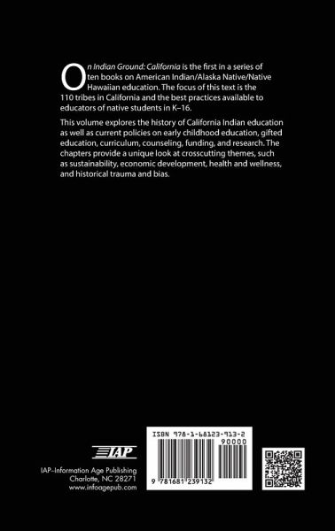 On Indian Ground: California is the first in a series of ten books on American Indian/Alaska Native/Native Hawaiian education. The focus of this text is the 110 tribes in California and the best practices available to educators of native students in K-16. This volume explores the history of California Indian education as well as current policies on early childhood education, gifted education, curriculum, counseling, funding, and research. The chapters provide a unique look at crosscutting themes, such as sustainability, economic development, health and wellness, and historical trauma and bias.