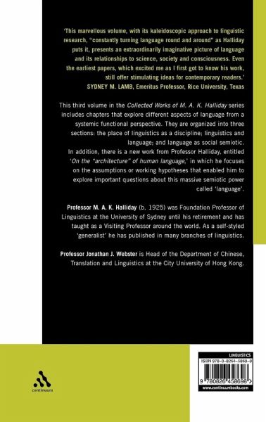 Introduction: on the "architecture" of human language Professor M. A. K. Halliday Section One: The Place of Linguistics as a Discipline Editor's Introduction 1. Syntax and the Consumer 2. Grammar, Society and the Noun 3. The Context of Linguistics 4. Ideas about Language 5. Language and the Order of Nature 6. New Ways of Meaning: the challenge to applied linguistics Section Two: Linguistics and Language Editor's Introduction 7. A Brief Sketch of Systemic Grammar 8. Systemic Background 9. Systemic Grammar and the Concept of a "Science of Language" 10. Language in a Changing World 11. A Recent View of "Missteps" in Linguistic Theory 12. Linguistics as Metaphor 13. Is the Grammar Neutral? Is the Grammarian Neutral? Section Three: Language as Social Semiotic Editor's Introduction 14. The Functional Basis of Language 15. Towards a Sociological Semantics 16. The History of a Sentence 17. The Act of Meaning 18. On Language in Relation to the Evolution of Human Consciousness Appendix: Systemic Theory