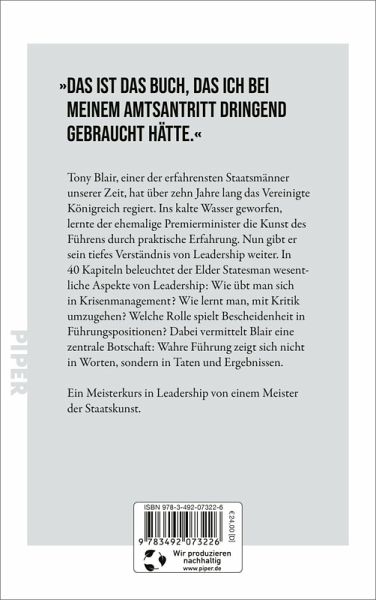 In diesem wegweisenden Werk enthüllt der große Staatsmann Tony Blair die Lektionen und Einsichten, die er sich während seiner Zeit als Premierminister des Vereinigten Königreichs von 1997 bis 2007 erarbeitet hat - das Buch, von dem er sagt, er hätte es zu Beginn seiner Amtszeit selbst dringend gebraucht. Konfrontiert mit den enormen Herausforderungen an der Spitze einer der mächtigsten Nationen der Welt, musste Blair ohne Leitfaden navigieren und lernte die Kunst des Regierens durch praktische Erfahrung. Jetzt teilt der Elder Statesman sein profundes Verständnis über Führung, basierend auf den Erfahrungen aus seiner Regierungszeit und zahllosen Gesprächen mit den wichtigsten Entscheidern dieser Welt. In 40 kompakten Kapiteln behandelt Blair essenzielle Fragen zu Führungskompetenzen, Krisenmanagement, der Bedeutung von KI, Umgang mit Kritik und der Bedeutung von Bescheidenheit. Er vermittelt dabei eine zentrale Botschaft: Effektive Führung misst sich nicht an Worten, sondern an Taten und Ergebnissen.