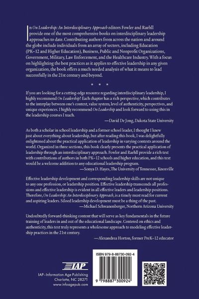 In On Leadership: An Interdisciplinary Approach editors Fowler and Raehll provide one of the most comprehensive books on interdisciplinary leadership approaches to date. Contributing authors from across the nation and around the globe include individuals from an array of sectors, including Education (PK-12 and Higher Education), Business, Public and Nonprofit Organizations, Government, Military, Law Enforcement, and the Healthcare Industry. With a focus on highlighting the best practices as it applies to effective leadership in any given organization, the book offers a much needed analysis of what it means to lead successfully in the 21st Century and beyond.