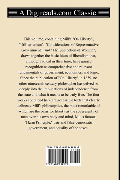 This volume, containing Mill's "On Liberty", "Utilitarianism", "Considerations of Representative Government", and "The Subjection of Women", draws together the basic ideas of liberalism that, although radical in their time, have gained recognition as comprehensive and relevant fundamentals of government, economics, and logic. Since the publication of "On Liberty" in 1859, no other nineteenth century philosopher has delved so deeply into the implications of independence from the state and what it means to be truly free. The four works contained here are accessible texts that clearly delineate Mill's philosophies, the most remarkable of which are the basis for liberty as the sovereignty of man over his own body and mind, Mill's famous "Harm Principle," true and false democratic government, and equality of the sexes.