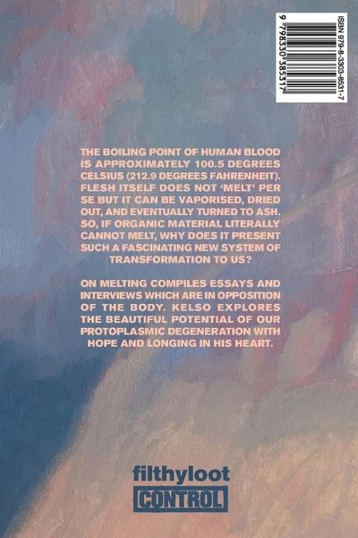 The boiling point of human blood is approximately 100.5 degrees Celsius (212.9 degrees Fahrenheit). Flesh itself does not 'melt' per say but it can be vaporised, dried out, and eventually turned to ash. So, if organic material literally cannot melt, why does it present such a fascinating new system of transformation to us? On Melting compiles essays and interviews which are in opposition of the body. Kelso explores the beautiful potential of our protoplasmic degeneration with hope and longing in his heart.