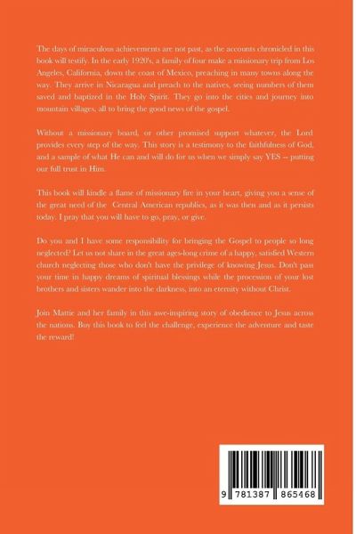 The days of miraculous achievements are not past, as the accounts chronicled in this book will testify. In the early 1920's, a family of four make a missionary trip from Los Angeles, California, down the coast of Mexico, preaching in many towns along the way. They arrive in Nicaragua and preach to the natives, seeing numbers of them saved and baptized in the Holy Spirit. They go into the cities and journey into mountain villages, all to bring the good news of the gospel. Without a missionary board, or other promised support whatever, the Lord provides every step of the way. This story is a testimony to the faithfulness of God, and a sample of what He can and will do for us when we simply say YES -- putting our full trust in Him. This book will kindle a flame of missionary fire in your heart, giving you a sense of the great need of the Central American republics, as it was then and as it persists today. I pray that you will have to go, pray, or give. Do you and I have some responsibility for bringing the Gospel to people so long neglected? Let us not share in the great ages-long crime of a happy, satisfied Western church neglecting those who don't have the privilege of knowing Jesus. Don't pass your time in happy dreams of spiritual blessings while the procession of your lost brothers and sisters wander into the darkness, into an eternity without Christ. Join Mattie and her family in this awe-inspiring story of obedience to Jesus across the nations. Buy this book to feel the challenge, experience the adventure and taste the reward!