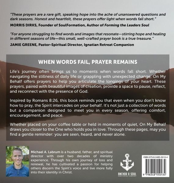 In life's moments of stillness or upheaval, when words fall short, On My Behalf: Prayers for When Words Fall Short offers a gentle companion. This book provides heartfelt prayers to voice the unspoken cries of your heart and pairs them with images of creation that reflect God's quiet presence. Rooted in the truth of Romans 8:26, it reminds you that even in silence, the Spirit intercedes with love too deep for words. Whether it rests on your coffee table or accompanies your morning quiet time, On My Behalf invites you to pause, reflect, and rest in the One who holds all things together. It is…mehr