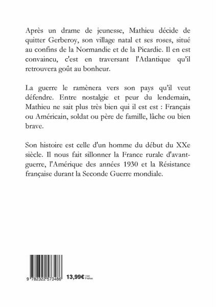 Mathieu en est convaincu : c'est en traversant l'Atlantique qu'il retrouvera goût au bonheur. Après un drame de jeunesse, il lui faut quitter Gerberoy et ses roses. Là-bas, en Amérique, il pourra se reconstruire... jusqu'à ce que la guerre le ramène à son pays, qu'il doit désormais défendre. Entre nostalgie et peur du lendemain, Mathieu ne sait plus très bien quel homme il est : Français ou Américain, soldat ou père de famille, lâche ou bien brave. L'histoire de Mathieu est celle d'un homme, du début du XXe siècle, qui nous fait sillonner la France rurale d'avant-guerre, l'Amérique des années 1930 et la Résistance française durant la Seconde Guerre mondiale.