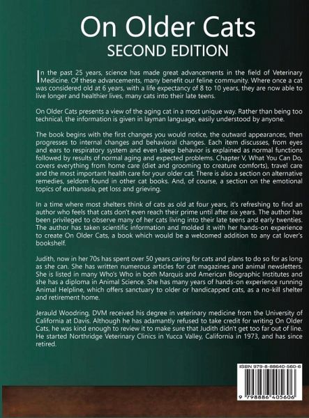 In the past 25 years, science has made great advancements in the field of Veterinary Medicine. Of these advancements, many benefit our feline community. Where once a cat was considered old at 6 years, with a life expectancy of 8 to 10 years, they are now able to live longer and healthier lives, many cats into their late teens. On Older Cats presents a view of the aging cat in a most unique way. Rather than being too technical, the information is given in layman language, easily understood by anyone. The book begins with the first changes you would notice, the outward appearances, then progresses to internal changes and behavioral changes. Each item discusses, from eyes and ears to respiratory system and even sleep behavior is explained as normal functions followed by results of normal aging and expected problems. Chapter V, What You Can Do, covers everything from home care (diet and grooming to creature comforts), travel care and the most important health care for your older cat. There is also a section on alternative remedies, seldom found in other cat books. And, of course, a section on the emotional topics of euthanasia, pet loss and grieving. In a time where most shelters think of cats as old at four years, it's refreshing to find an author who feels that cats don't even reach their prime until after six years. The author has been privileged to observe many of her cats living into their late teens and early twenties. The author has taken scientific information and molded it with her hands-on experience to create On Older Cats, a book which would be a welcomed addition to any cat lover's bookshelf.