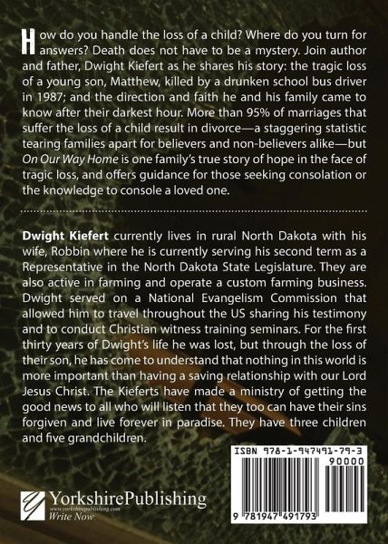 How do you handle the loss of a child? Where do you turn for answers? Death does not have to be a mystery. Join author and father, Dwight Kiefert as he shares his story: the tragic loss of a young son, Matthew, killed by a drunken school bus driver in 1987; and the direction and faith he and his family came to know after their darkest hour. More than 95% of marriages that su er the loss of a child result in divorce-a staggering statistic tearing families apart for believers and non-believers alike-but On Our Way Home is one family's true story of hope in the face of tragic loss, and offers guidance for those seeking consolation or the knowledge to console a loved one.