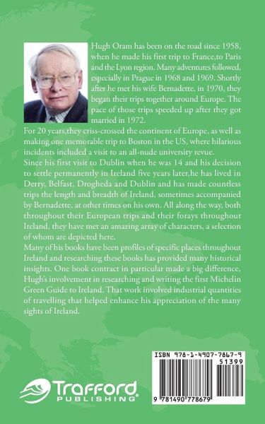 Hugh Oram has been on the road since 1958, when he made his first trip to France,to Paris and the Lyon region. Many adventures followed, especially in Prague in 1968 and 1969. Shortly after he met his wife Bernadette, in 1970, they began their trips together around Europe. The pace of those trips speeded up after they got married in 1972. For 20 years,they criss-crossed the continent of Europe, as well as making one memorable trip to Boston in the US, where hilarious incidents included a visit to an all-nude university revue. Since his first visit to Dublin when he was 14 and his decision to settle permanently in Ireland five years later,he has lived in Derry, Belfast, Drogheda and Dublin and has made countless trips the length and breadth of Ireland, sometimes accompanied by Bernadette, at other times on his own. All along the way, both throughout their European trips and their forays throughout Ireland, they have met an amazing array of characters, a selection of whom are depicted here. Many of his books have been profiles of specific places throughout Ireland and researching these books has provided many historical insights. One book contract in particular made a big difference, Hugh's involvement in researching and writing the first Michelin Green Guide to Ireland. That work involved industrial quantities of travelling that helped enhance his appreciation of the many sights of Ireland.