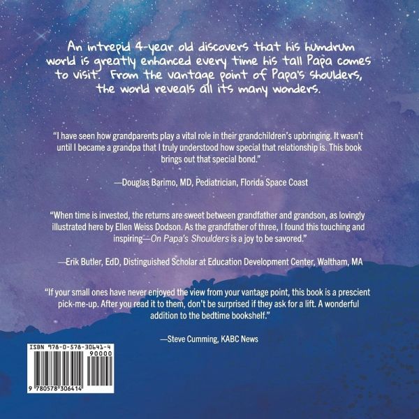 An intrepid 4-year old discovers that his humdrum world is greatly enhanced every time his tall Papa comes to visit. From the vantage point of Papa's shoulders, the world reveals all its many wonders. It illustrates a special bond between a grandparent and a young grandchild. Charmingly written in verse and richly illustrated by Travis Kotzebue. It is an ideal book for reading to toddlers age 3-5.