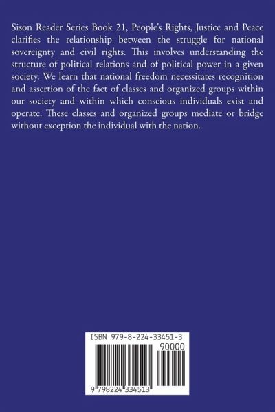 Sison Reader Series Book 21, People's Rights, Justice and Peace clarifies the relationship between the struggle for national sovereignty and civil rights. This involves understanding the structure of political relations and of political power in a given society. We learn that national freedom necessitates recognition and assertion of the fact of classes and organized groups within our society and within which conscious individuals exist and operate. These classes and organized groups mediate or bridge without exception the individual with the nation.