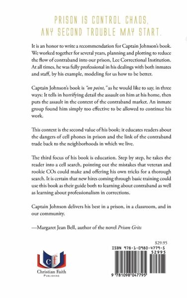 It is an honor to write a recommendation for Captain Johnson's book. We worked together for several years, planning and plotting to reduce the flow of contraband into our prison, Lee Correctional Institution. At all times, he was fully professional in his dealings with both inmates and staff, by his example, modeling for us how to be better. Captain Johnson's book is "on point," as he would like to say, in three ways: It tells in horrifying detail the assault on him at his home, then puts the assault in the context of the contraband market. An inmate group found him simply too effective to be allowed to continue his work. This context is the second value of his book; it educates readers about the dangers of cell phones in prison and the link of the contraband trade back to the neighborhoods in which we live. The third focus of his book is education. Step by step, he takes the reader into a cell search, pointing out the mistakes that veteran and rookie COs could make and offering his own tricks for a thorough search. It is certain that new hires coming through basic training could use this book as their guide both to learning about contraband as well as learning about professionalism in corrections. Captain Johnson delivers his best in a prison, in a classroom, and in our community. -Margaret Jean Bell, author of the novel Prison Grits