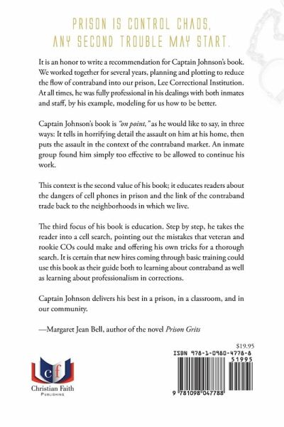 It is an honor to write a recommendation for Captain Johnson's book. We worked together for several years, planning and plotting to reduce the flow of contraband into our prison, Lee Correctional Institution. At all times, he was fully professional in his dealings with both inmates and staff, by his example, modeling for us how to be better. Captain Johnson's book is "on point," as he would like to say, in three ways: It tells in horrifying detail the assault on him at his home, then puts the assault in the context of the contraband market. An inmate group found him simply too effective to be allowed to continue his work. This context is the second value of his book; it educates readers about the dangers of cell phones in prison and the link of the contraband trade back to the neighborhoods in which we live. The third focus of his book is education. Step by step, he takes the reader into a cell search, pointing out the mistakes that veteran and rookie COs could make and offering his own tricks for a thorough search. It is certain that new hires coming through basic training could use this book as their guide both to learning about contraband as well as learning about professionalism in corrections. Captain Johnson delivers his best in a prison, in a classroom, and in our community. -Margaret Jean Bell, author of the novel Prison Grits