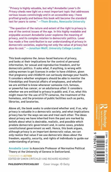 "Privacy is highly valuable, but why? Annabelle Lever's On Privacy sheds new light on a most important topic that addresses various issues convincingly and in an accessible way. I have profited greatly and believe this book will become the standard text for years to come." - Thom Brooks, Durham University, UK
