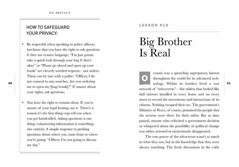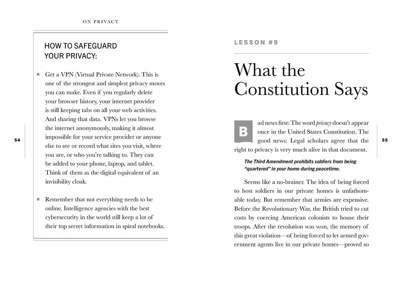 Introduction Lesson #1: The Nothing-to-Hide Trap Lesson #2: Know Where the Battlefields Are Lesson #3: Privacy Creates Space for Intimacy Lesson #4: We Are Prisoners of Our Recorded Past Lesson #5: Apathy is Understandable Lesson #6: Small Data Paint Big Pictures Lesson #7: We Can Have Our Cake and Eat It, Too Lesson #8: Privacy Is Essential to Human Dignity Lesson #9: What the Constitution Says Lesson #10: Big Brother Is Real Lesson #11: Our Bodies Are Sacred Lesson #12: It’s Not All About You Lesson #13: The Reasonable Expectation Standard Lesson #14: Privacy is Essential to Mental Health Lesson #15: It’s About the Money Lesson #16: So Make Privacy Profitable Lesson #17: The Road to Hell Is Paved with Good Intentions Lesson #18: Governments Need (Some) Privacy, Too Lesson #19: Insist on Privacy by Design Lesson #20: Privacy Makes for Unlikely Bedfellows