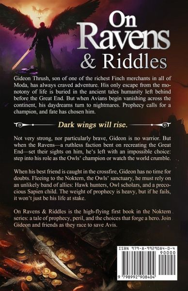 Gideon Thrush, son of one of the richest Finch merchants in all of Moda, has always craved adventure. His only escape from the monotony of life is buried in the ancient tales humanity left behind before the Great End. But when Avians begin vanishing across the continent, his daydreams turn to nightmares. Prophecy calls for a champion, and fate has chosen him. Not very strong, nor particularly brave, Gideon is no warrior. But when the Ravens-a ruthless faction bent on recreating the Great End-set their sights on him, he's left with an impossible choice: step into his role as the Owls' champion or watch the world crumble. When his best friend is caught in the crossfire, Gideon has no time for doubts. Fleeing to the Noktern, the Owls' sanctuary, he must rely on an unlikely band of allies: Hawk hunters, Owl scholars, and a precocious Sapien child. The weight of prophecy is heavy, but if he fails, it won't just be his life at stake. On Ravens & Riddles is the high-flying first book in the Noktern series: a tale of prophecy, peril, and the choices that forge a hero. Join Gideon and friends as they race to save Avis.