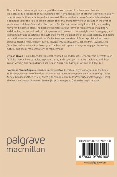 This book is an interdisciplinary study of the human drama of replacement. Is one's irreplaceability dependent on surrounding oneself by a replication of others? Is love intrinsically repetitious or built on a fantasy of uniqueness? The sense that a person's value is blotted out if someone takes their place can be seen in the serial monogamy of our age and in the lives of 'replacement children' - children born into a family that has recently lost a child, whom they may even be named after. The book investigates various forms of replacement, including AI and doubling, incest and bedtricks, imposters and revenants, human rights and 'surrogacy', and intertextuality and adaptation. The authors highlight the emotions of betrayal, jealousy and desire both within and across generations. On Replacement consists of 24 essays divided into seven sections: What is replacement?, Law & society, Wayward women, Lost children, Replacement films, The Holocaust and Psychoanalysis. The book willappeal to anyone engaged in reading cultural and social representations of replacement.