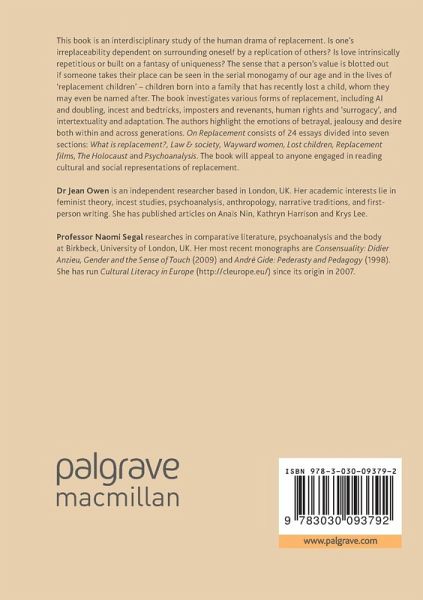 This book is an interdisciplinary study of the human drama of replacement. Is one's irreplaceability dependent on surrounding oneself by a replication of others? Is love intrinsically repetitious or built on a fantasy of uniqueness? The sense that a person's value is blotted out if someone takes their place can be seen in the serial monogamy of our age and in the lives of 'replacement children' - children born into a family that has recently lost a child, whom they may even be named after. The book investigates various forms of replacement, including AI and doubling, incest and bedtricks, imposters and revenants, human rights and 'surrogacy', and intertextuality and adaptation. The authors highlight the emotions of betrayal, jealousy and desire both within and across generations. On Replacement consists of 24 essays divided into seven sections: What is replacement?, Law & society, Wayward women, Lost children, Replacement films, The Holocaust and Psychoanalysis. The book willappeal to anyone engaged in reading cultural and social representations of replacement.