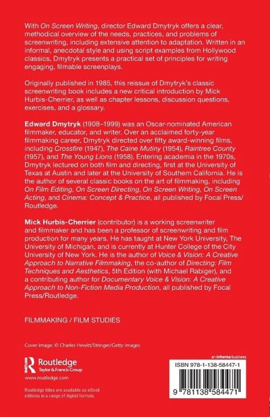 With On Screen Writing, director Edward Dmytryk offers a clear, methodical overview of the needs, practices, and problems of screenwriting, including extensive coverage of adaptation. Written In an informal, anecdotal style and using script examples from Hollywood classics, Dmytryk presents a practical set of principles for writing engaging, filmable screenplays. Originally published in 1985, this reissue of Dmytryk's classic screenwriting book includes a new critical introduction by Mick Hurbis-Cherrier, as well as chapter lessons, discussion questions, exercises, and a glossary.
