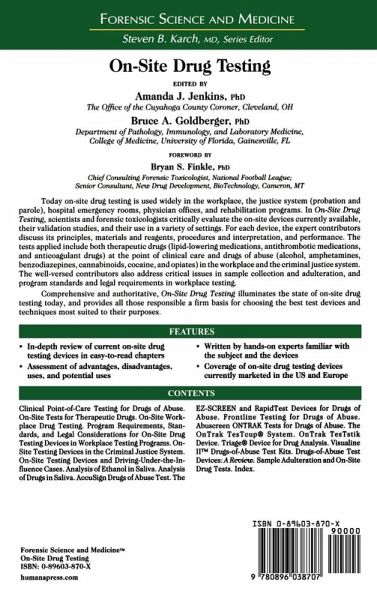 "...The eighteen chapters successfully review all aspects of on-site drug testing from the needs of many various programs, evaluation of devices and and test kits, and the legal and medical contexts that form the background against which this science must be applied. The authors are international authorities with a huge aggregate professional experience in analytical toxicology of alcohol and drug detection in biological specimens. They provide for the careful reader a critical review, conclusions, and recommendations concerning the present status and future viability of point-of-care, on-site testing...On-Site Drug Testing is timely and will serve as a landmark in the progress of this science."-From the Foreword by Bryan S. Finkle, PhD, DABFT, Consulting Forensic Toxicologist, Cameron, MT