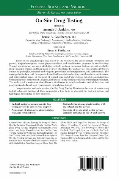 "...The eighteen chapters successfully review all aspects of on-site drug testing from the needs of many various programs, evaluation of devices and and test kits, and the legal and medical contexts that form the background against which this science must be applied. The authors are international authorities with a huge aggregate professional experience in analytical toxicology of alcohol and drug detection in biological specimens. They provide for the careful reader a critical review, conclusions, and recommendations concerning the present status and future viability of point-of-care, on-site testing...On-Site Drug Testing is timely and will serve as a landmark in the progress of this science."-From the Foreword by Bryan S. Finkle, PhD, DABFT, Consulting Forensic Toxicologist, Cameron, MT