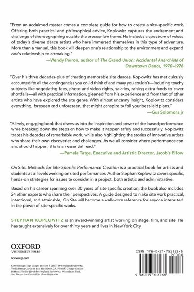 On Site: Methods for Site-Specific Performance Creation is a practical book for artists and students at all levels who create or are learning to create making sited dance works. Author Stephan Koplowitz covers specific, hands-on strategies for an array of issues to consider before, during, and after embarking upon a project, including site selection, procuring permits, designing the audience experience, researching and exploring a site for inspiration and content, differences in urban and natural environments, definitions of key production roles, building effective collaborations with artists, and techniques to generate site-inspired production elements such as sound/music, costumes, lighting, and media. He also offers helpful chapters on project budgeting, contract negotiation, fundraising, marketing, documentation, and assessment. Based on the author's career spanning over 30 years of site-specific creation, the book also includes the voices of over 24 other artists, producers, and writers who share their perspectives and experiences on the many topics covered. A guide designed to make site work practical, intentional, and attainable, On Site will become a well-worn reference for anyone interested in the creative process and discovering the power of site-specific works.