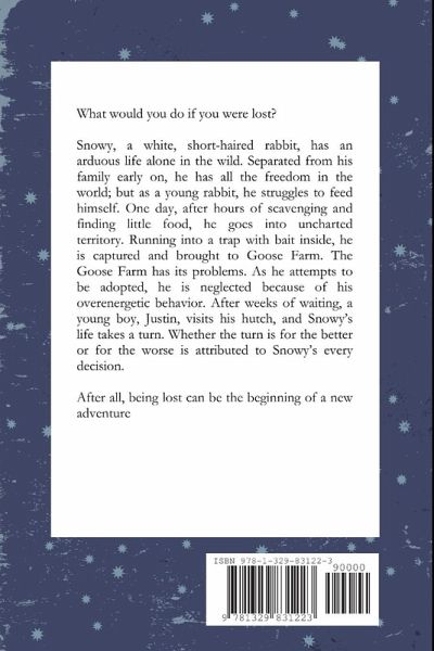 What would you do if you were lost? Snowy, a white, short-haired rabbit, has an arduous life alone in the wild. Separated from his family early on, he has all the freedom in the world; but as a young rabbit, he struggles to feed himself. One day, after hours of scavenging and finding little food, he goes into uncharted territory. Running into a trap with bait inside, he is captured and brought to Goose Farm. The Goose Farm has its problems. As he attempts to be adopted, he is neglected because of his overenergetic behavior. After weeks of waiting, a young boy, Justin, visits his hutch, and Snowy's life takes a turn. Whether the turn is for the better or for the worse is attributed to Snowy's every decision. After all, being lost can be the beginning of a new adventure