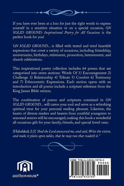 If you have ever been at a loss for just the right words to express yourself in a sensitive situation or on a special occasion, ON SOLID GROUND: Inspirational Poetry for All Occasions is the perfect book for you! ON SOLID GROUND... is filled with tested and tried heartfelt expressions that cover a variety of occasions, including friendship, anniversaries, birthdays, retirement, promotion, bereavement, and church celebrations. This inspirational poetry collection includes 64 poems that are categorized into seven sections: Words Of 1) Encouragement 2) Challenge 3) Relationship 4) Tribute 5) Comfort 6) Testimony and 7) Ethnocentric Expressions. Each section opens with an introduction and all poems include a scripture reference from the King James Bible version. The combination of poems and scriptures contained in ON SOLID GROUND... will caress your soul and serve as a refreshing spiritual treat for your personal reading pleasure. Likewise, the hearts of diverse readers and hearers from youthful youngsters to seasoned seniors will be encouraged, making this book a wonderful all occasions gift for your family, friends, and special loved ones. (Habakkuk 2:2) "And the Lord answered me, and said, Write the vision, and make it plain upon tables, that he may run that readeth it."